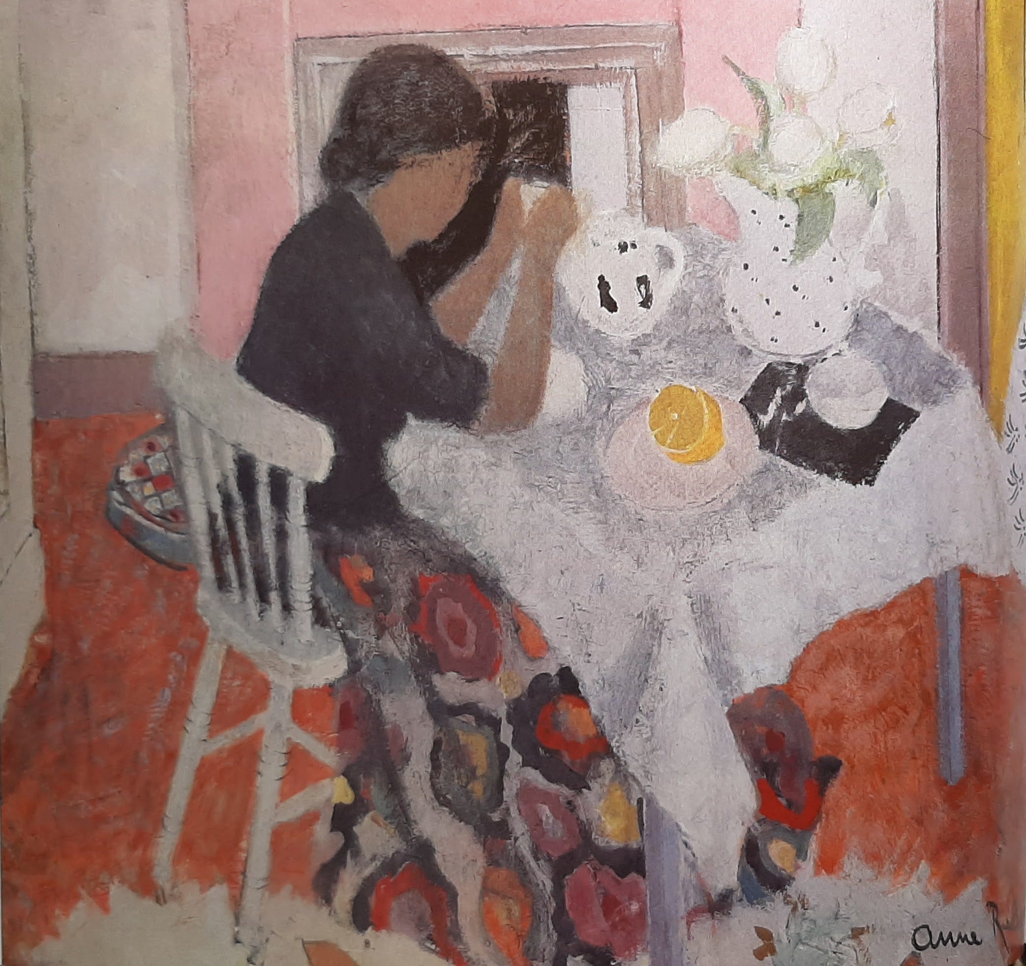There’s a painting I love by Anne Redpath in the National Galleries in Edinburgh. It’s a still life on a table, with a rug and a chair. The perspective has been tilted to let the viewer enjoy all the items in the still life, without missing out on the pattern of the rug, which has become a backdrop. Lots of the colours are quite chalky, but there are reds and oranges in there that just glow.