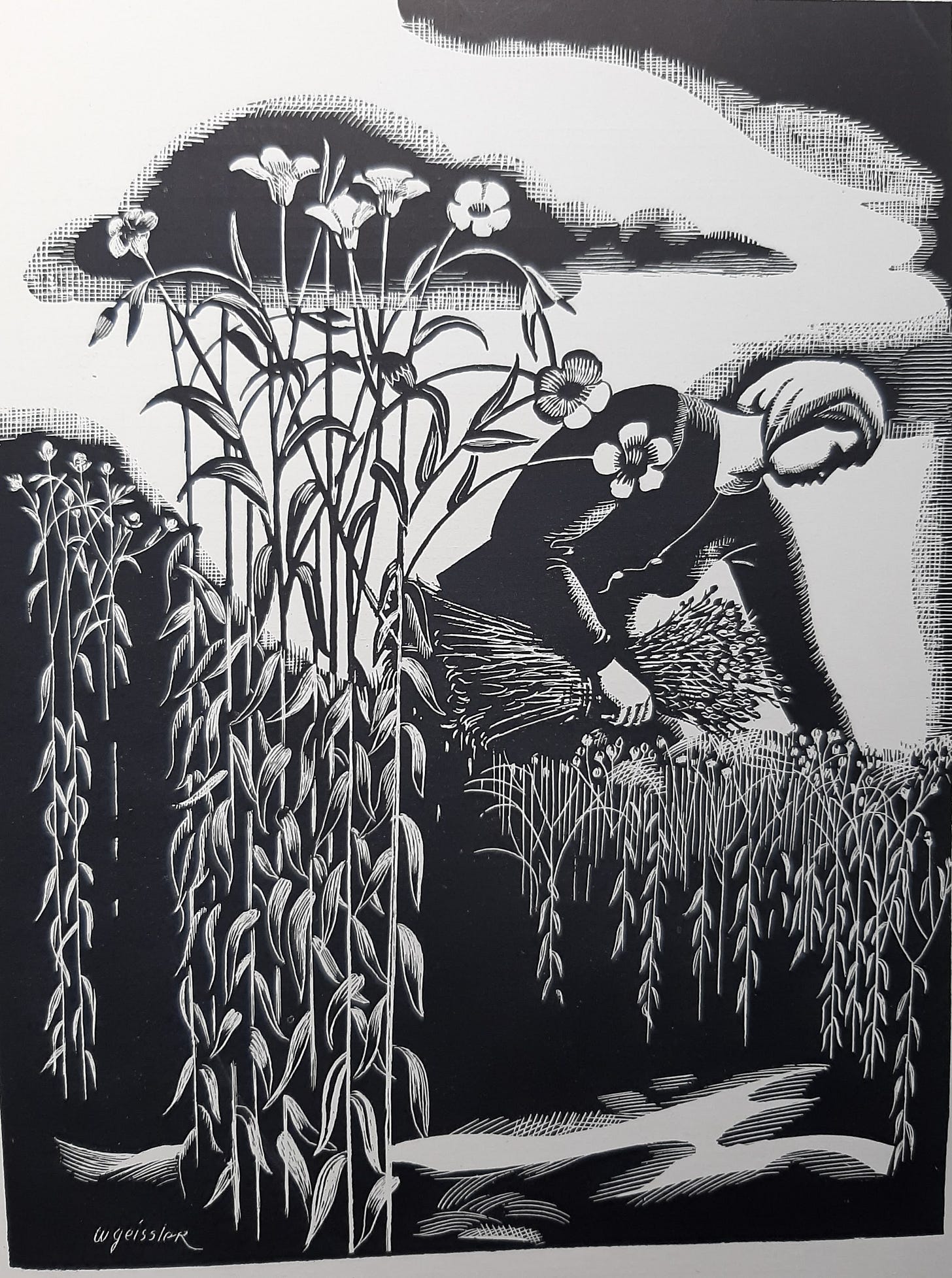 I wanted to discover more Anne Redpaths, so I looked up the other artists in the Edinburgh School. One of them was William Geissler. I couldn’t find a book about his work, but I did find a book full of it! He illustrated a whole brochure on papermaking fibres. His images show the general structure and the characteristic features of plants used for papermaking, but for some reason he’s taken it upon himself to make the images attractive and interesting too.